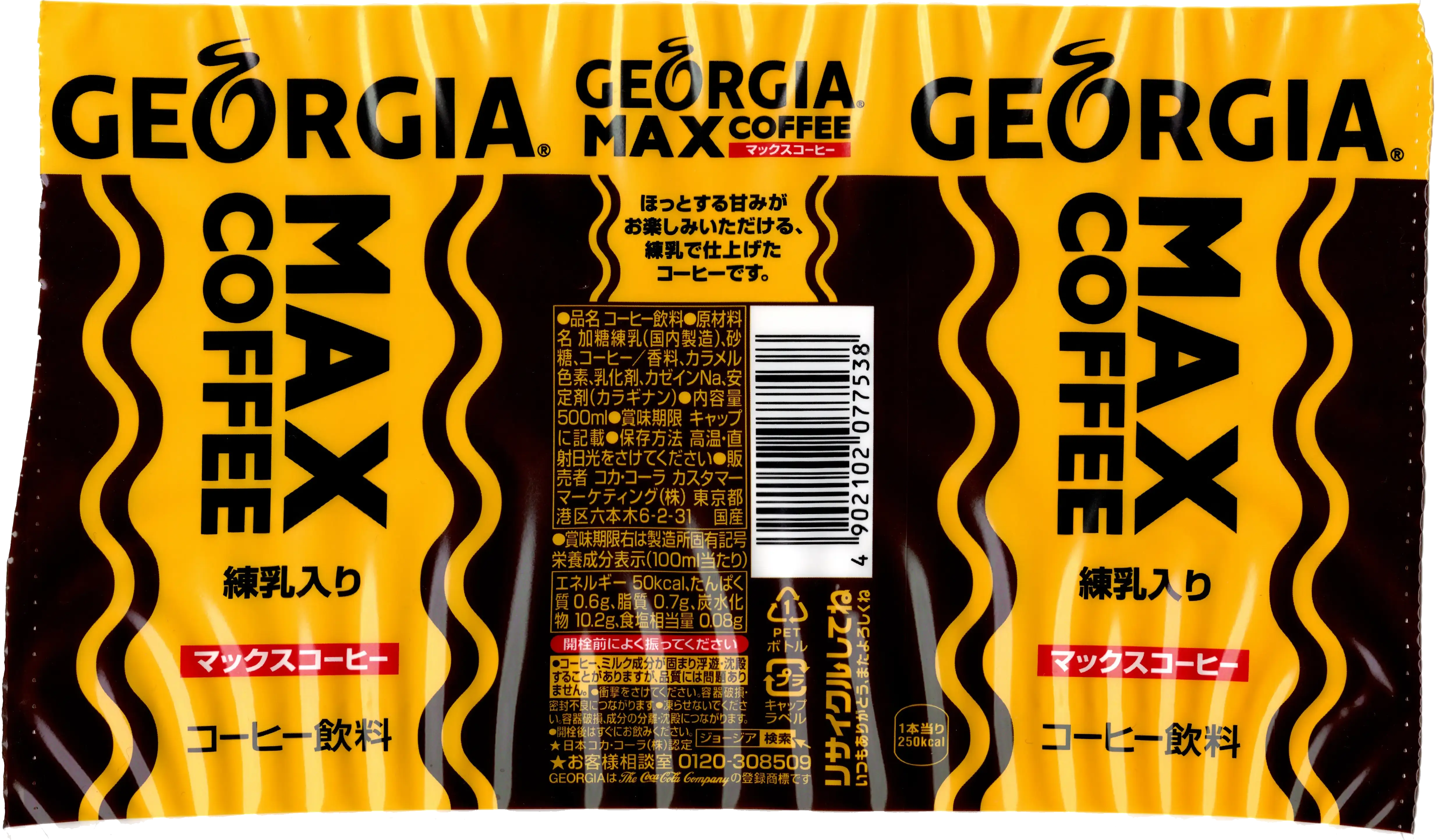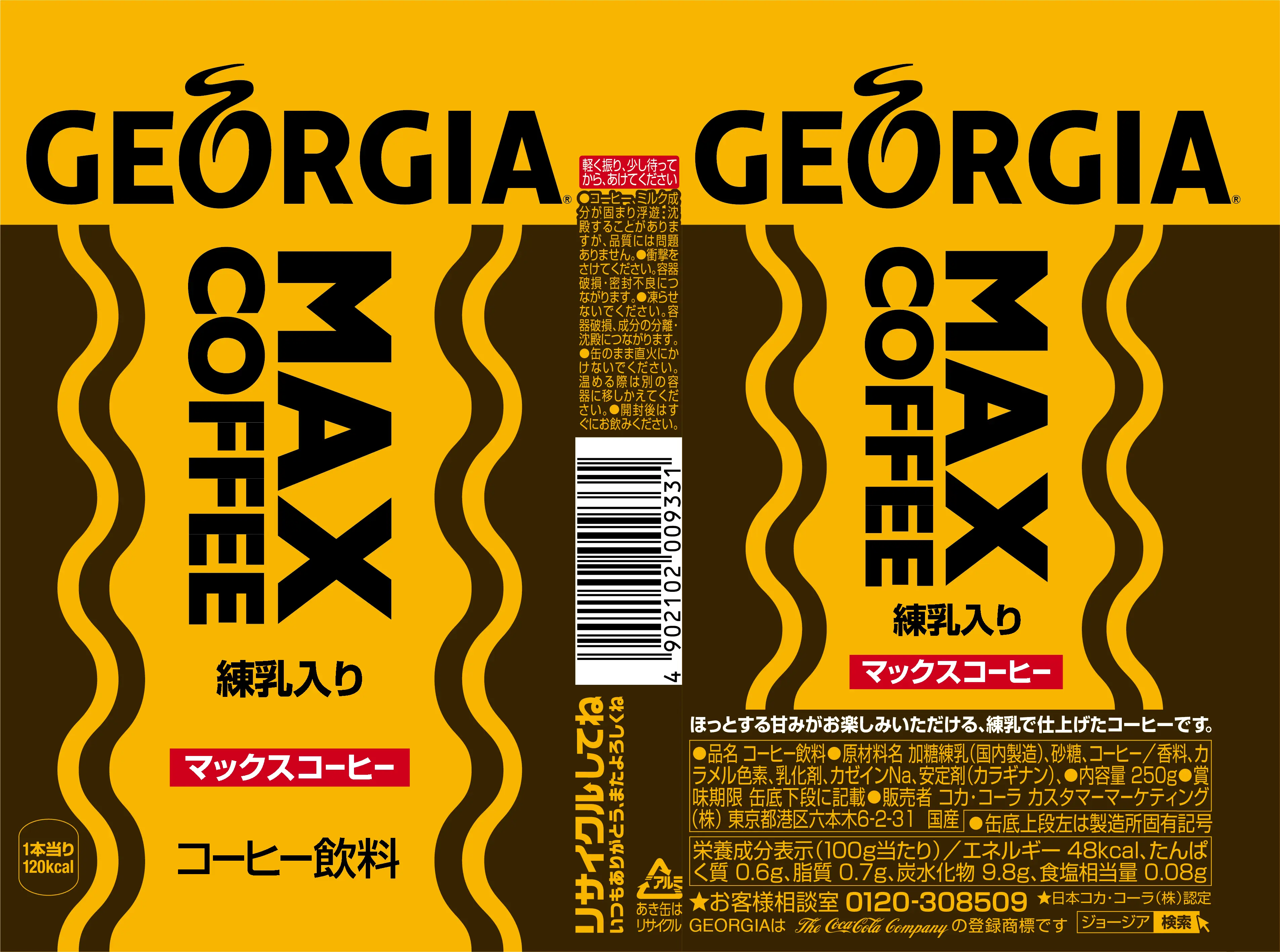 | 黒 | 「MAX COFFEE」「GEOGIA」のロゴ、「練乳入り」「コーヒー飲料」の文字、バーコードの文字色。恐らく K100。 |
