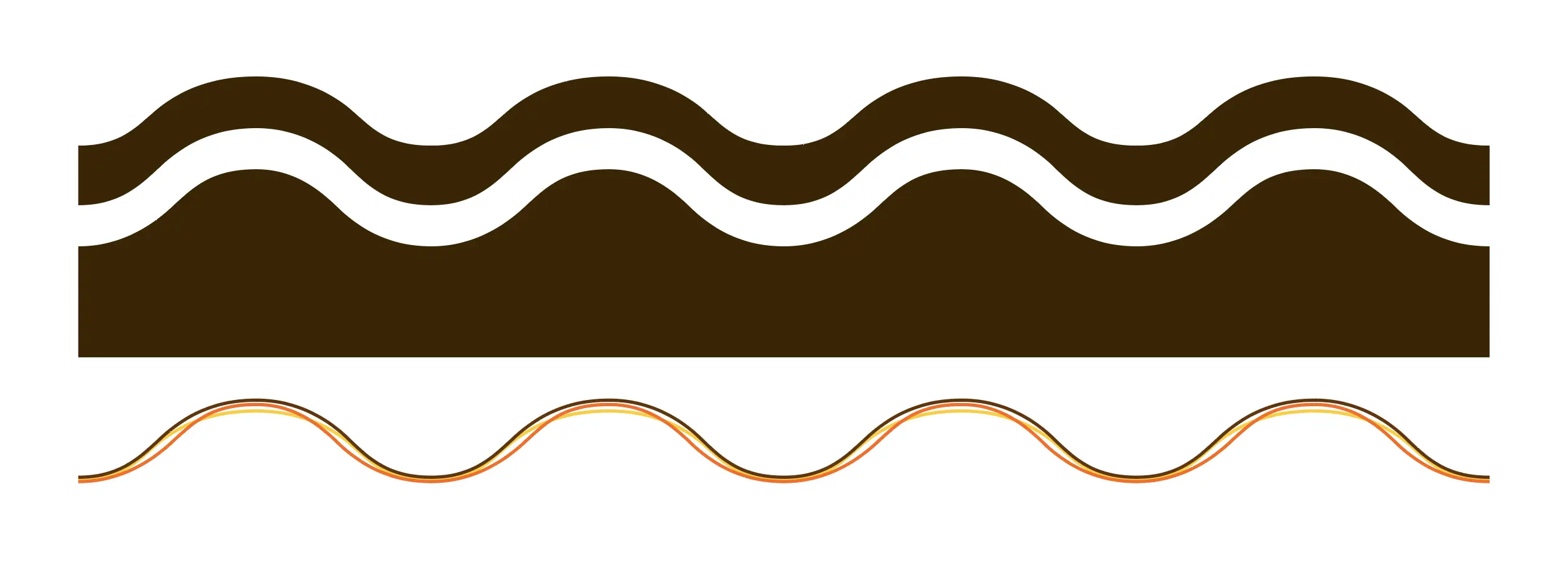ロゴ横に長さ 95.5 mm の波線(図 6)が 4 箇所あしらわれ、1 本の波線に対して周期が 3 回(背面は 3 回、縮尺も異なる)ずつ存在します。サイン波のような風貌ですがサイン波ではなく、線幅も一定ではありません。1 箇所につき、外側、中央、内側と 3 つの曲線が存在しますが、これらの形状はすべて異なります。さらには、1 つの山に対して左右対称ですらない、という謎な曲線です。
